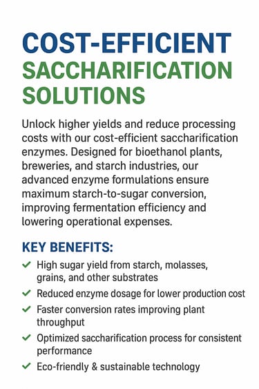 Unlock higher yields and reduce processing costs with our cost-efficient saccharification enzymes. Designed for bioethanol plants, breweries, and starch industries, our advanced enzyme formulations ensure maximum starch-to-sugar conversion, improving fermentation efficiency and lowering operational expenses.