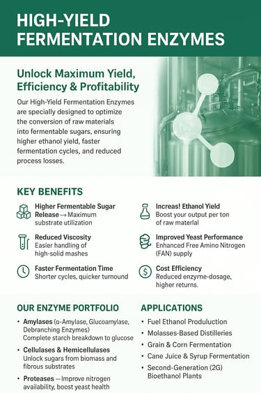 Our High-Yield Fermentation Enzymes are specially designed to optimize the conversion of raw materials into fermentable sugars, ensuring higher ethanol yield, faster fermentation cycles, and reduced process losses.