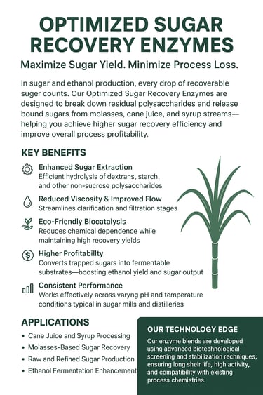 In sugar and ethanol production, every drop of recoverable sugar counts. Our Optimized Sugar Recovery Enzymes are designed to break down residual polysaccharides and release bound sugars from molasses, cane juice, and syrup streams—helping you achieve higher sugar recovery efficiency and improve overall process profitability.